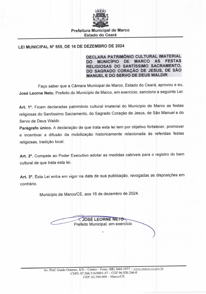 No final do ano de 2024, o então Prefeito interino da cidade de Marco/CE, José Leorne Neto, sancionou a Lei Municipal n° 555, de 16 de dezembro de 2024, que declara patrimônio cultural imaterial do município de Marco as festas de Corpus Christi, do Sagrado Coração de Jesus, de São Manuel e do Servo de Deus Waldir Lopes de Castro.